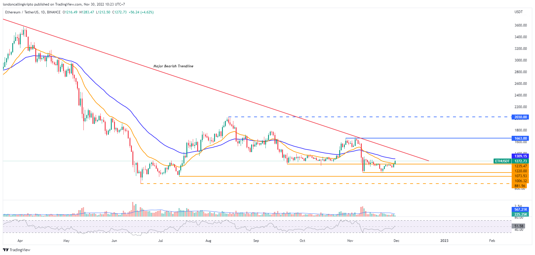 Saat artikel ini dibuat, pergerakan harga ETH terlihat sudah breakout resistance terdekatnya pada level $1.235 dan bergerak diatas 20-day EMA.