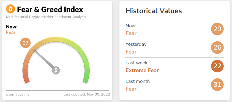 Penutupan hijau pada kandil harian pagi ini pada sebagian besar major coin menjadi sentimen positif untuk keseluruhan market kripto. Fear and greed index ditutup pada level 29, dengan kategori fear, lebih tinggi tiga point dari penutupan 28 November.