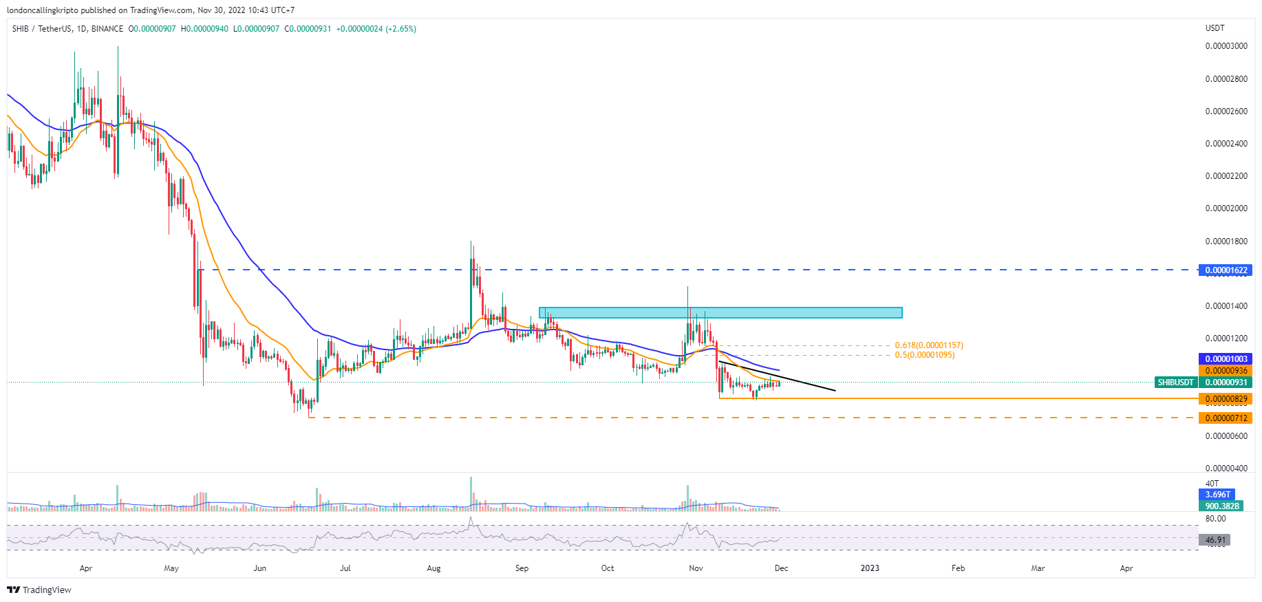 Pergerakan harga SHIB terlihat sideways didalam descending triangle setelah berhasil bounce pada penurunan 21 November.