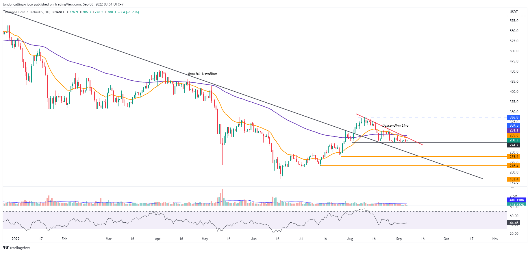 Day-20 EMA menjadi penghalang yang harus ditembus untuk kembali menarik sentimen market dan kembali bergerak agresif. Resistance di level $307 menjadi target terdekat apabila harga BNB bisa breakout day-20 EMA dan descending line. Target utama masih berada di level $336 yang merupakan puncak bullish BNB pada 10 Agustus.