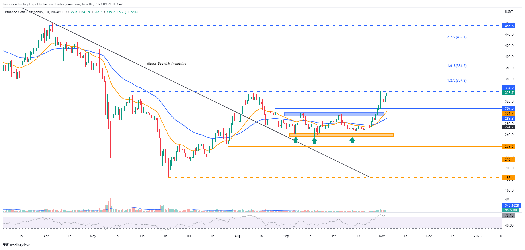 BNB kembali pullback setelah turun dan membentuk support baru pada harga terendah penutupan kandil harian 2 November di level $315,3.