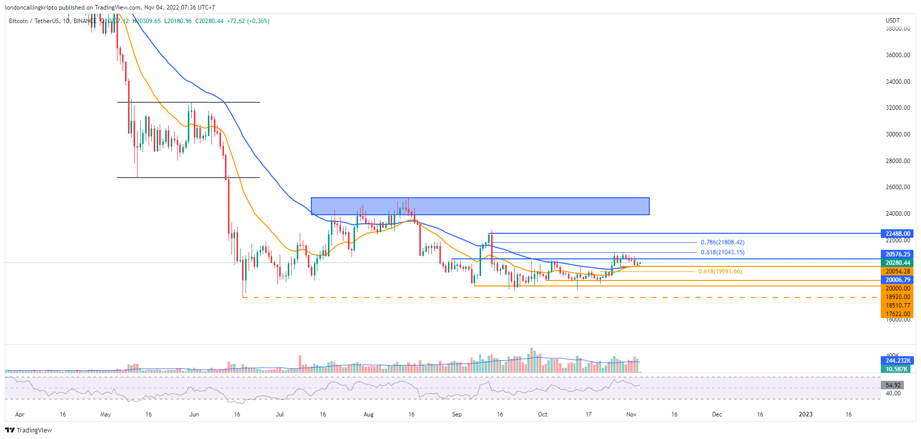 Apabila pergerakan harga Bitcoin mampu breakout resistance terdekat nya, kemungkinan laju naik akan berlanjut dengan target berada pada harga tertinggi penutupan kandil harian 29 Oktober di level $20.554.