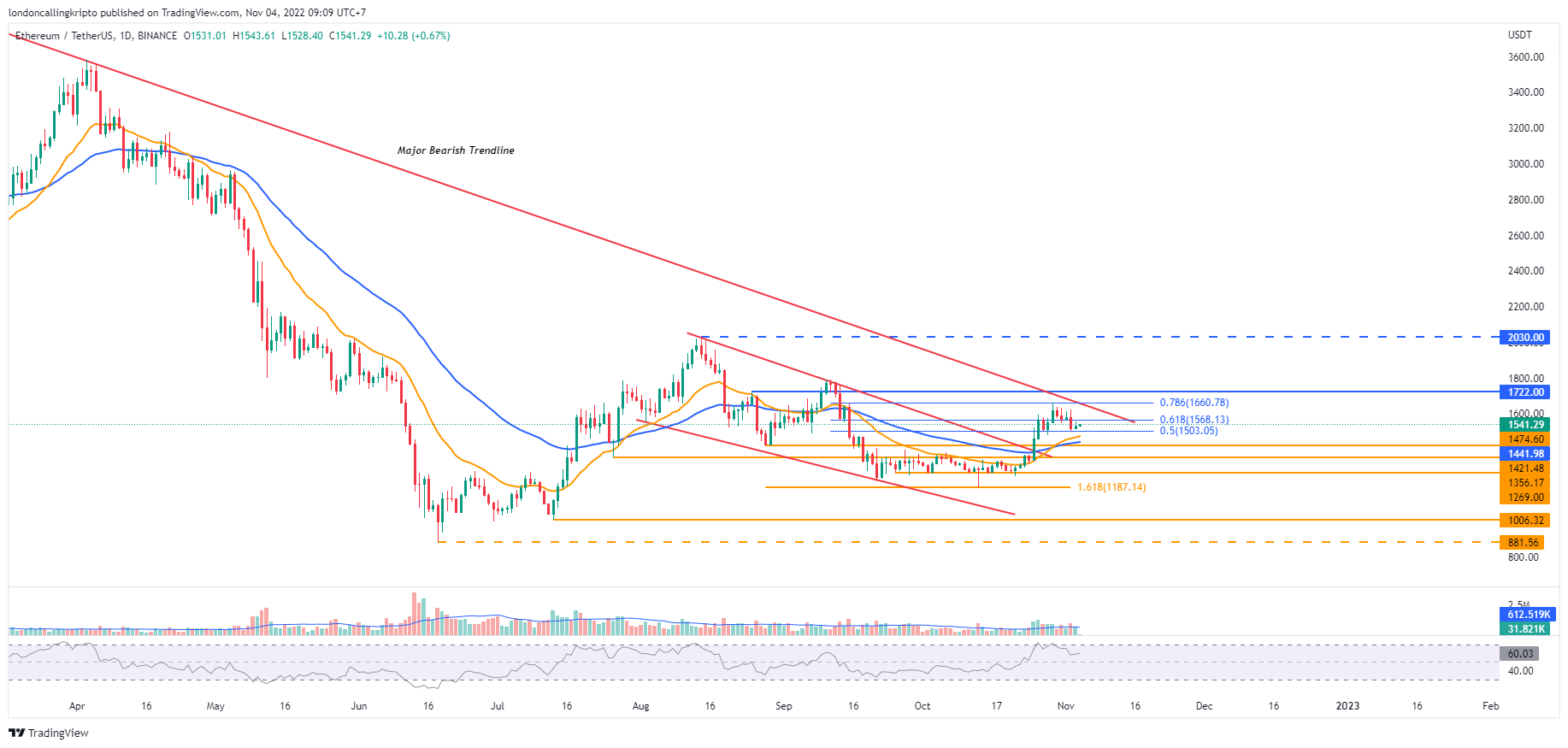 Breakout terhadap titik tersebut menjadi kunci untuk bergerak lebih naik. Kemungkinan laju bullish akan berlanjut hingga mencapai level $1.660 apabila harga ETH berhasil breakout.