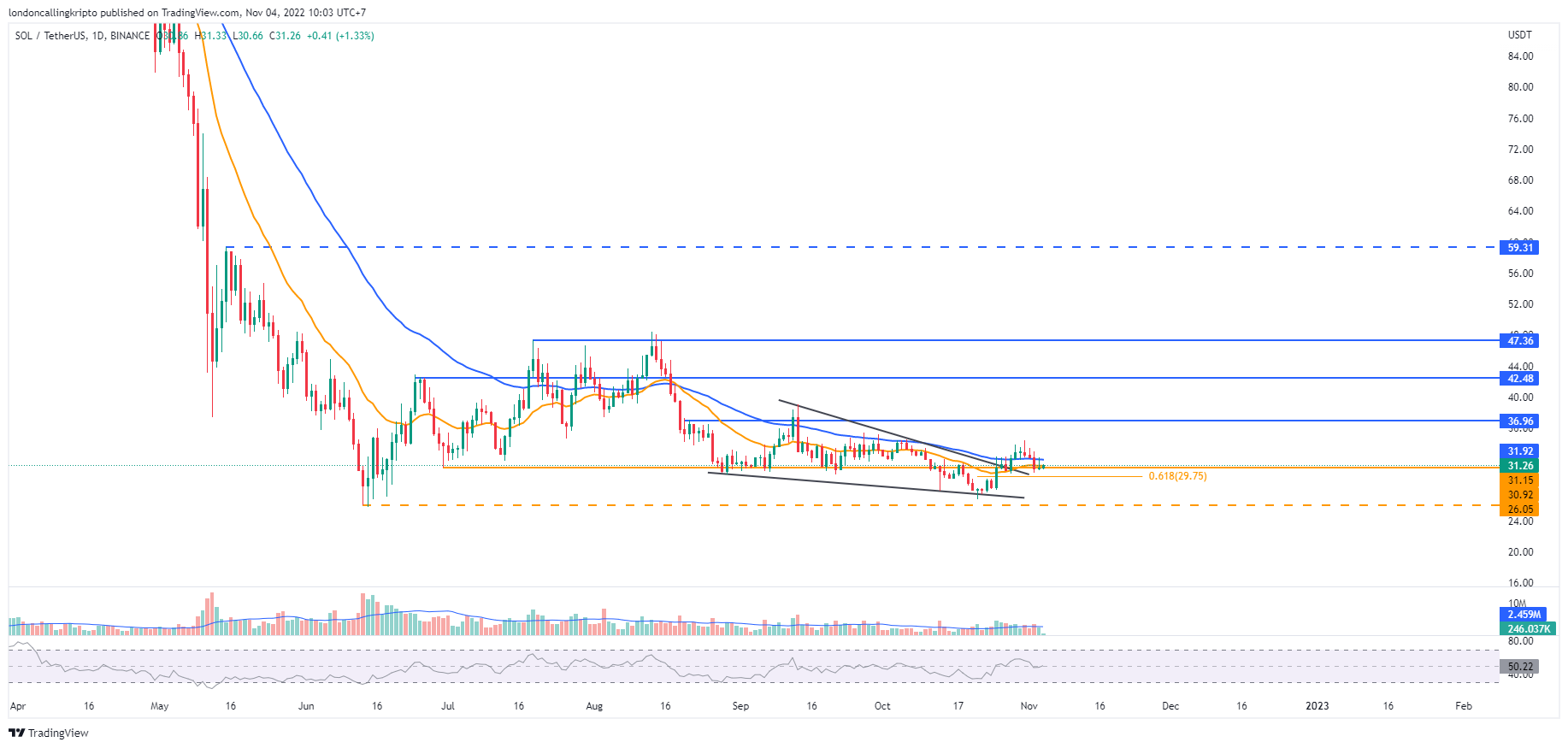 Penurunan harga SOL tertahan support di level $30,92. Titik support tersebut merupakan tahanan yang cukup solid untuk membalikan arah harga.