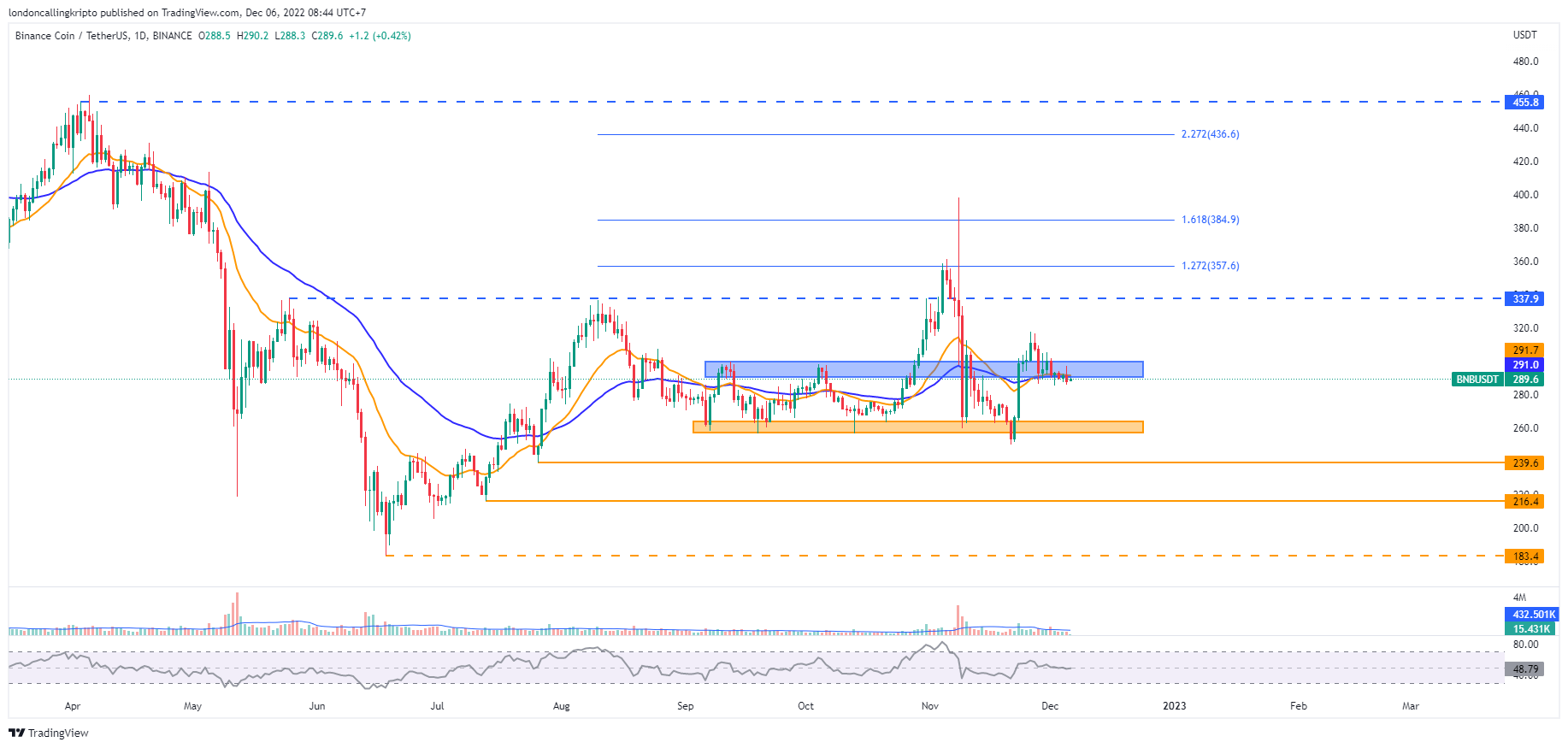 Area resistance pada level $290,6-$300 masih menjadi area sideways BNB. Pergerakan agresif kemungkinan akan terasa ketika harga BNB memutuskan untuk breakout resistance atau breakdown support-nya.