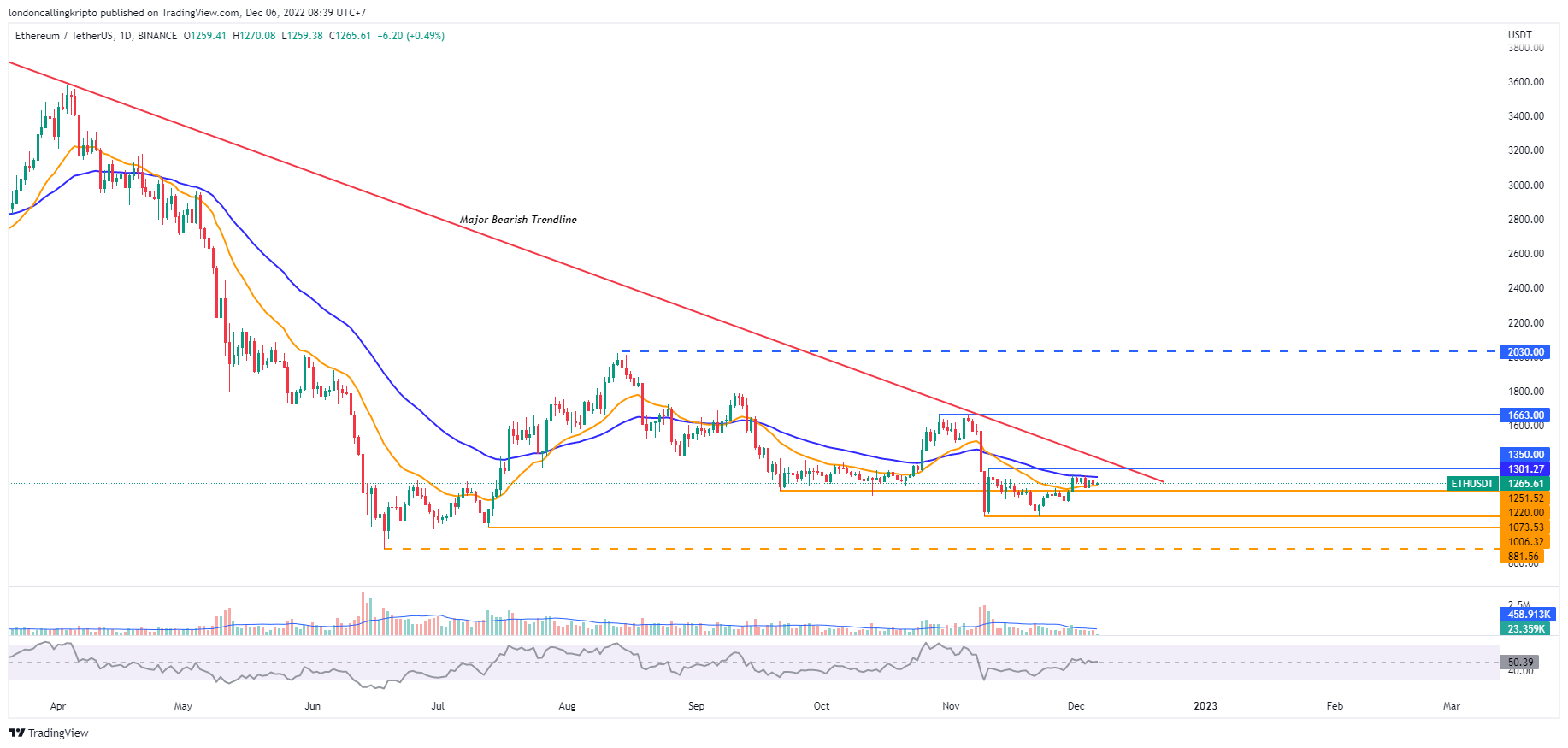 Area sideways ETH berada pada 20-day EMA di level $1.251 sebagai titik support, dan 50-day EMA di level $1.301 sebagai resistance terdekat.