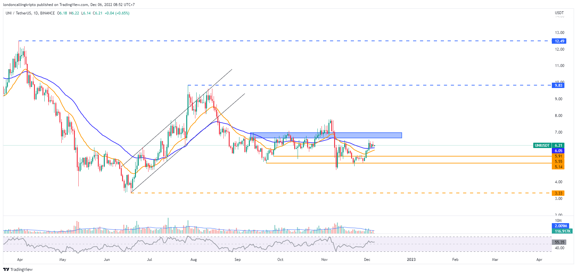 Peluang pullback UNI semakin lebar setelah breakout support yang menjadi resistance di level $5,55. Pembalikan tren dari turun menjadi naik di konfirmasi setelah breakout 20-day EMA di level $5,91.