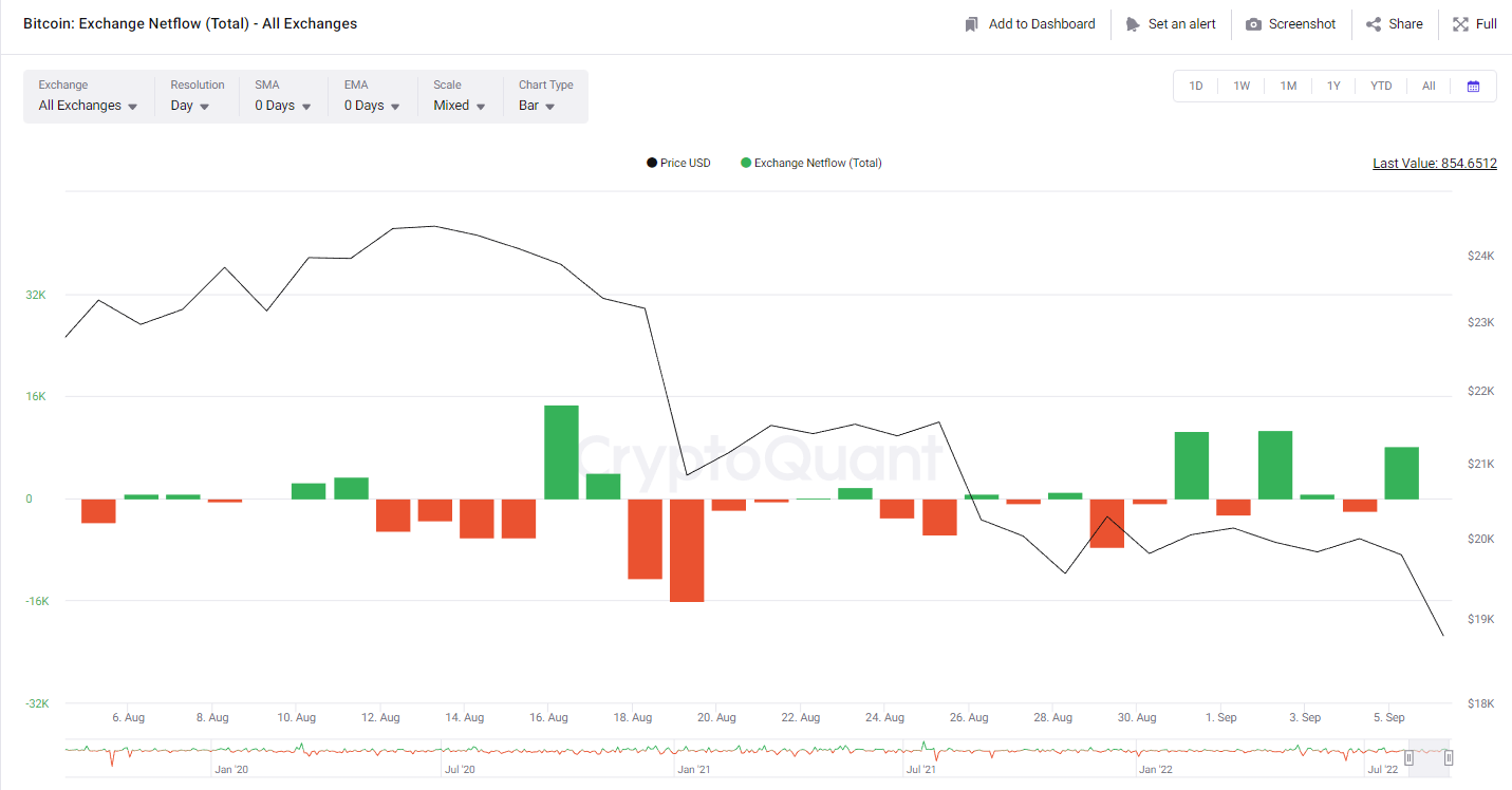 Bitcoin exchange netflow pada awal September ditutup positif dengan jumlah yang tinggi, terlihat arus masuk (inflow) masih mendominasi dan lebih tinggi dari arus keluar (outflow). Kondisi tersebut menjadi indikator terhadap aksi jual yang akan dilakukan dan hal tersebut direspons pada penutupan kandil harian pagi ini.