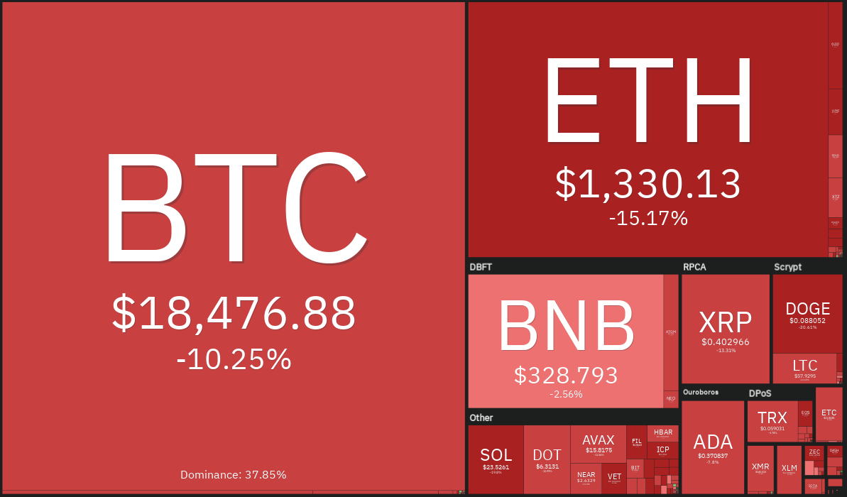Bitcoin sebagai coin dengan kapitalisasi terbesar turun tajam sebesar 9,93%, diikuti oleh ETH, altcoin dengan kapitalisasi terbesar yang turun sebesar 14,88%, dan BNB yang cukup resist terhadap kondisi saat ini, hanya turun 2,85% dalam 24 jam terakhir.