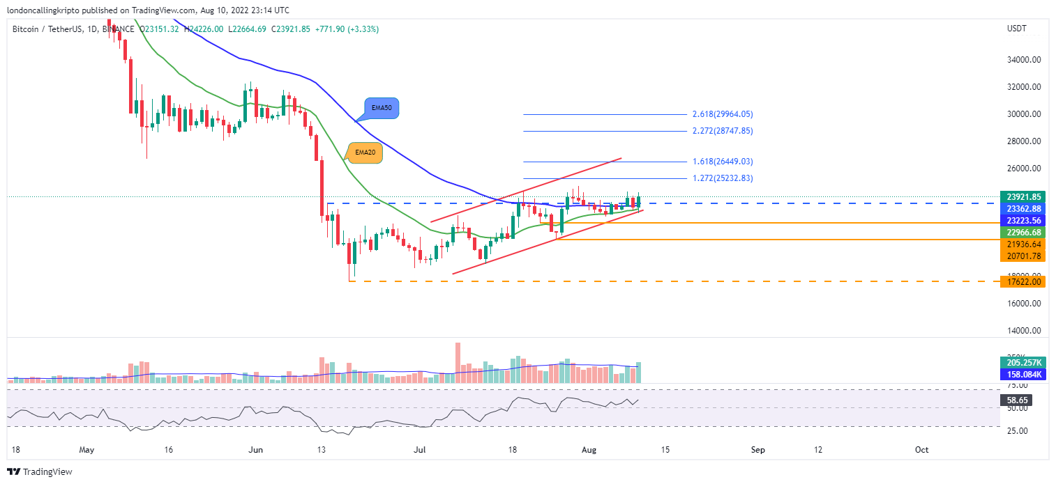Jika terkonfirmasi breakout, maka target laju kenaikan Bitcoin berada di level $25.232-$26.449. Day-20 EMA pada level $22.964 akan menjadi support terdekat apabila harga Bitcoin mengalami koreksi.