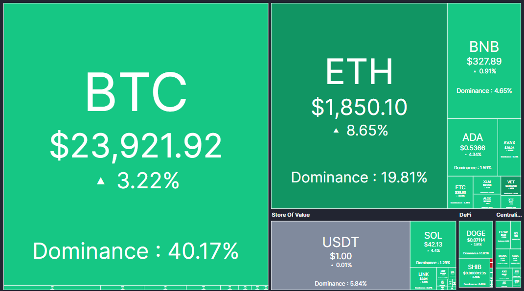 Bitcoin mengalami kenaikan sebesar 4% dengan dominasi yang kembali menyentuh angka 40,17%. Diikuti oleh ETH, altcoin dengan kapitalisasi terbesar, yang mencatatkan kenaikan yang cukup tinggi sebesar 9,38% dengan dominasi terbesar kedua yaitu 19,81%.