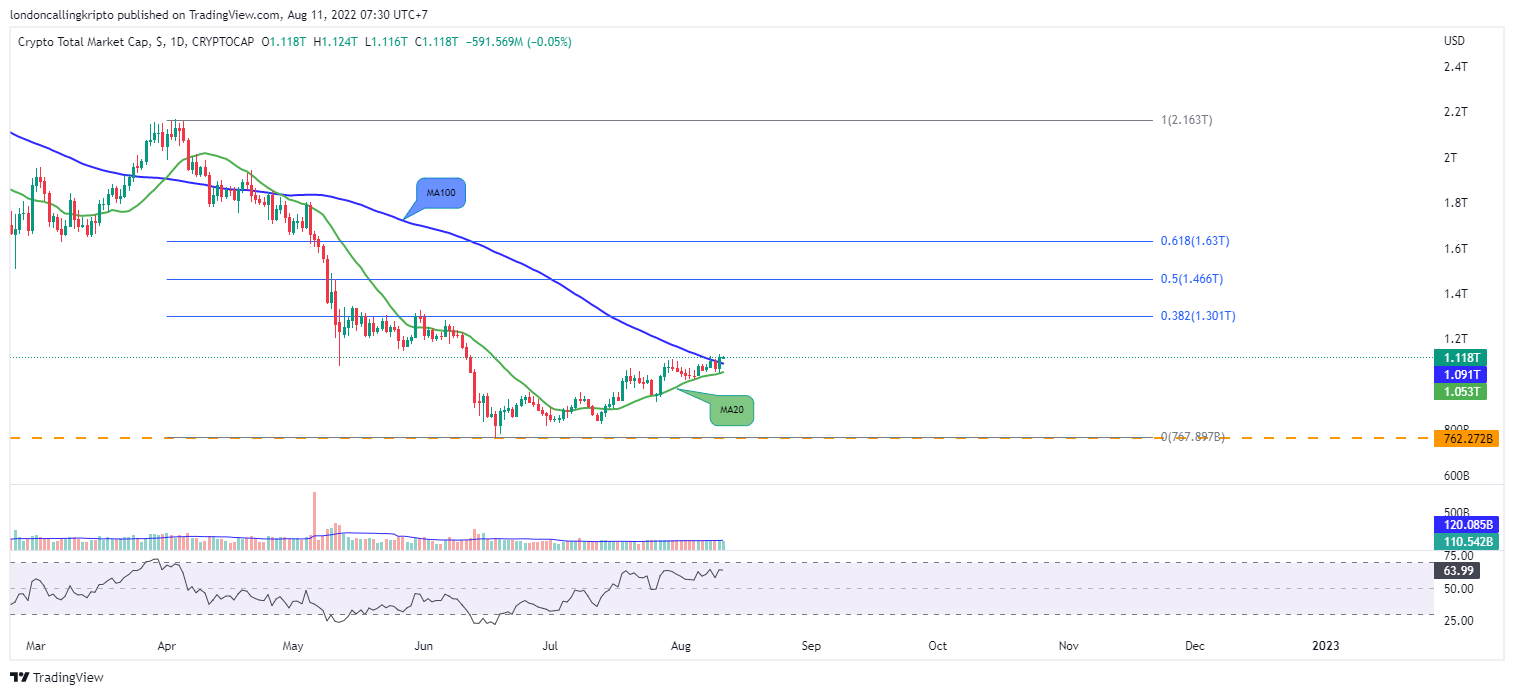 Total kapitalisasi market kripto terlihat bullish setelah berhasil ditutup diatas day-100 moving average (MA). Target kenaikan selanjutnya kemungkinan akan berada pada level $1.301 Trilliun.