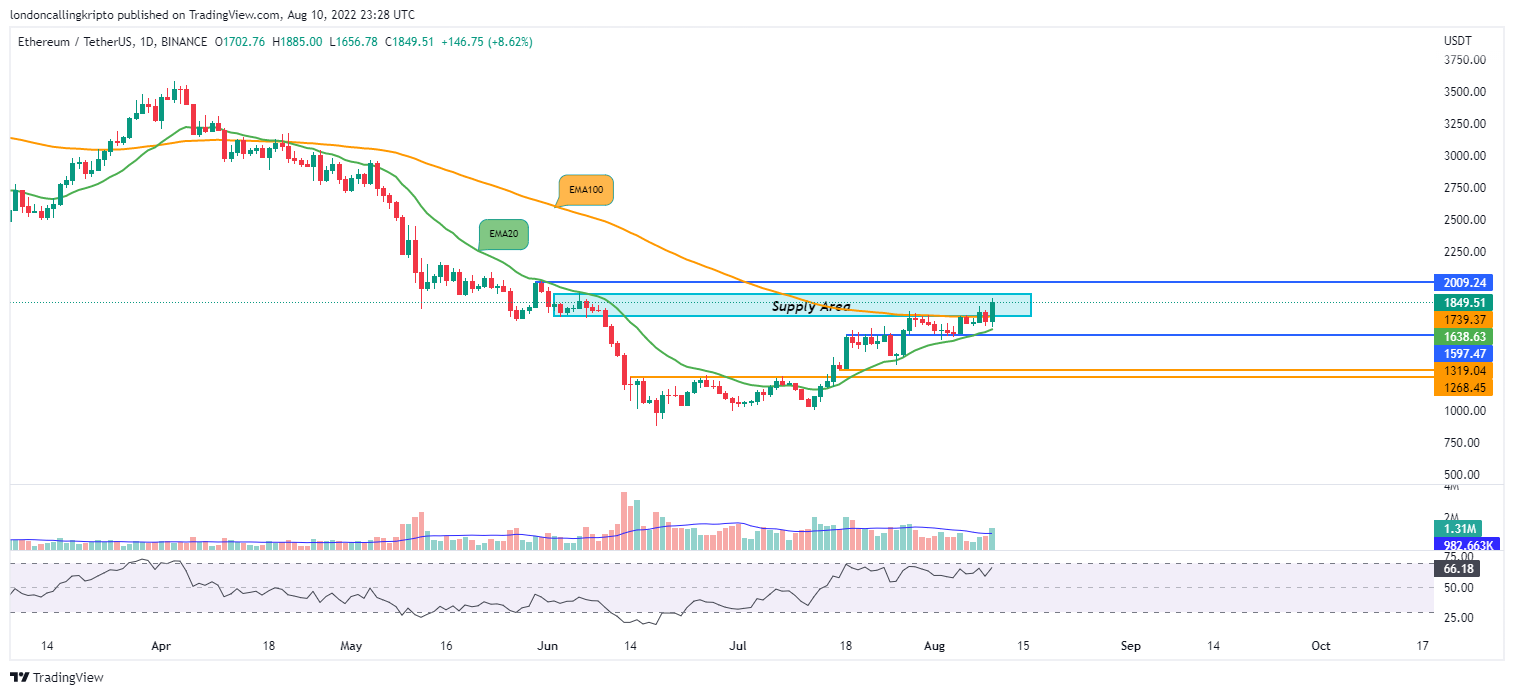 Target kenaikan ETH berada pada level $2.009, apabila berhasil breakout dari area supply. Support masih berada di day-20 EMA pada level $1.638 sebagai tahanan yang cukup solid apabila harga ETH kembali koreksi.