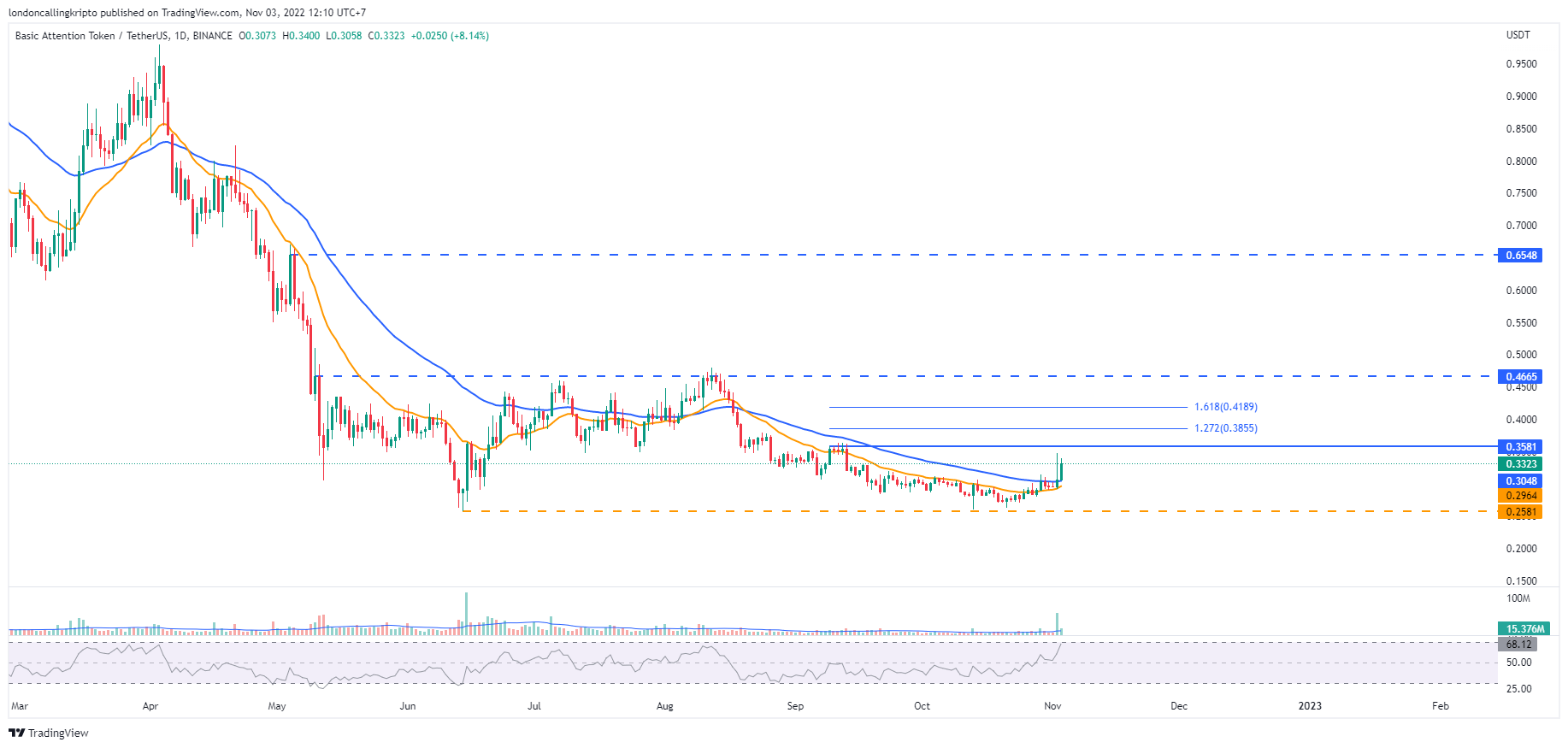 50-Day EMA pada level $0,3048 menjadi titik support sebagai tahanan apabila harga BAT kembali koreksi.