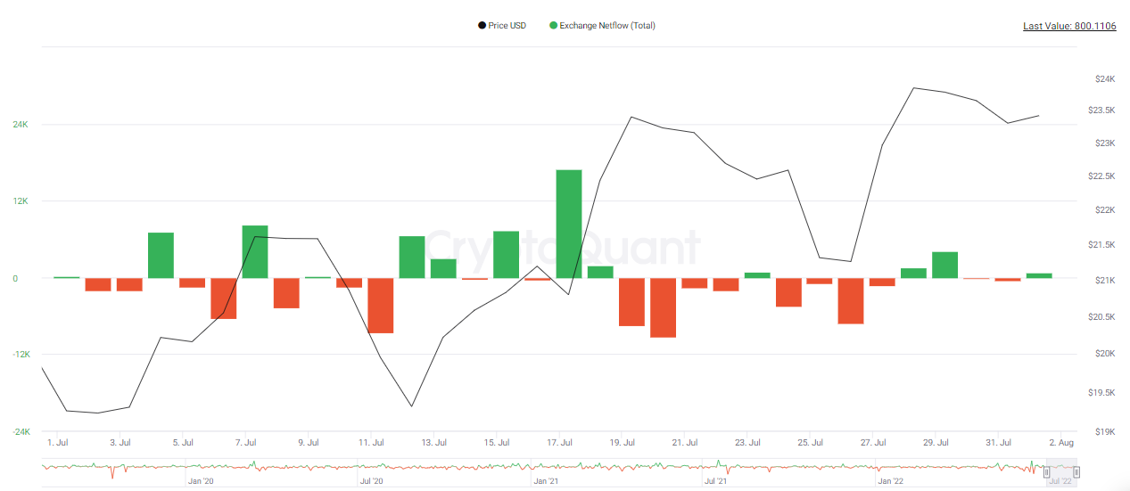 Pekan pertama dan kedua di bulan Juli, terlihat net flow exhange didominasi oleh Bitcoin yang keluar. Kondisi terebut menjelaskan bahwa banyaknya aksi beli yang dilakukan di saat harga Bitcoin berada pada $19.254-$20.581, dan hal tersebut mampu mendorong harga Bitcoin naik hingga mencapai level $23.395.