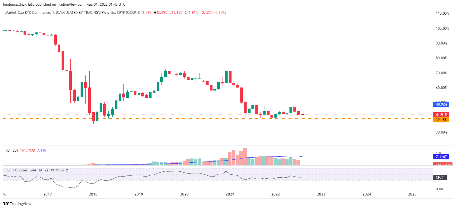 Kenaikan harga Bitcoin pada bulan Juli bertolak belakang dengan dominasinya. Bitcoin dominance atau dominasi Bitcoin kembali ditutup merah, lebih rendah dari bulan sebelumnya. Kandil bulanan Bitcoin dominance (BTC.D) pada bulan Juli ditutup pada level 42,03%, mengalami penurunan sebesar 4,37%.