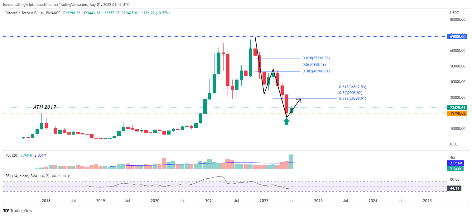 Melihat dari sejarah pergerakan harga Bitcoin yang sudah dijelaskan tersebut, ada kemungkinan bahwa penutupan kandil bulan Juli bisa menjadi pemicu dan awal yang baik untuk kenaikan harga Bitcoin. Target kenaikan apabila Bitcoin mampu mempertahankan laju kenaikannya berada pada harga $29.298, dan solid support masih berada pada harga $19.798.