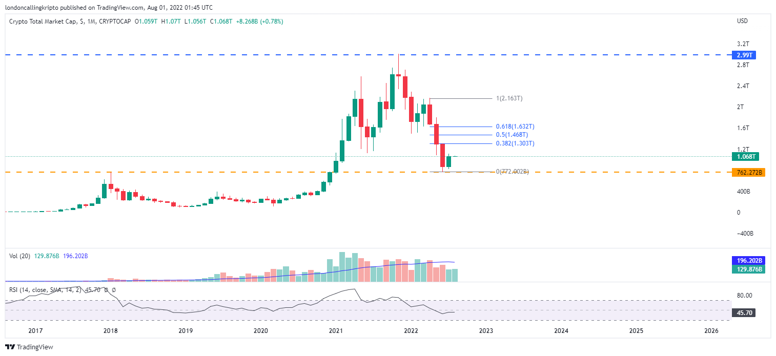 Pada Juni lalu, total market cap pada aset kripto turun sebesar 33% hingga menyentuh level $762,828 Miliar. Tetapi pada bulan Juli, total market cap pada aset kripto berhasil naik sebesar 22,38% dan kembali berada pada level $1 Triliun.