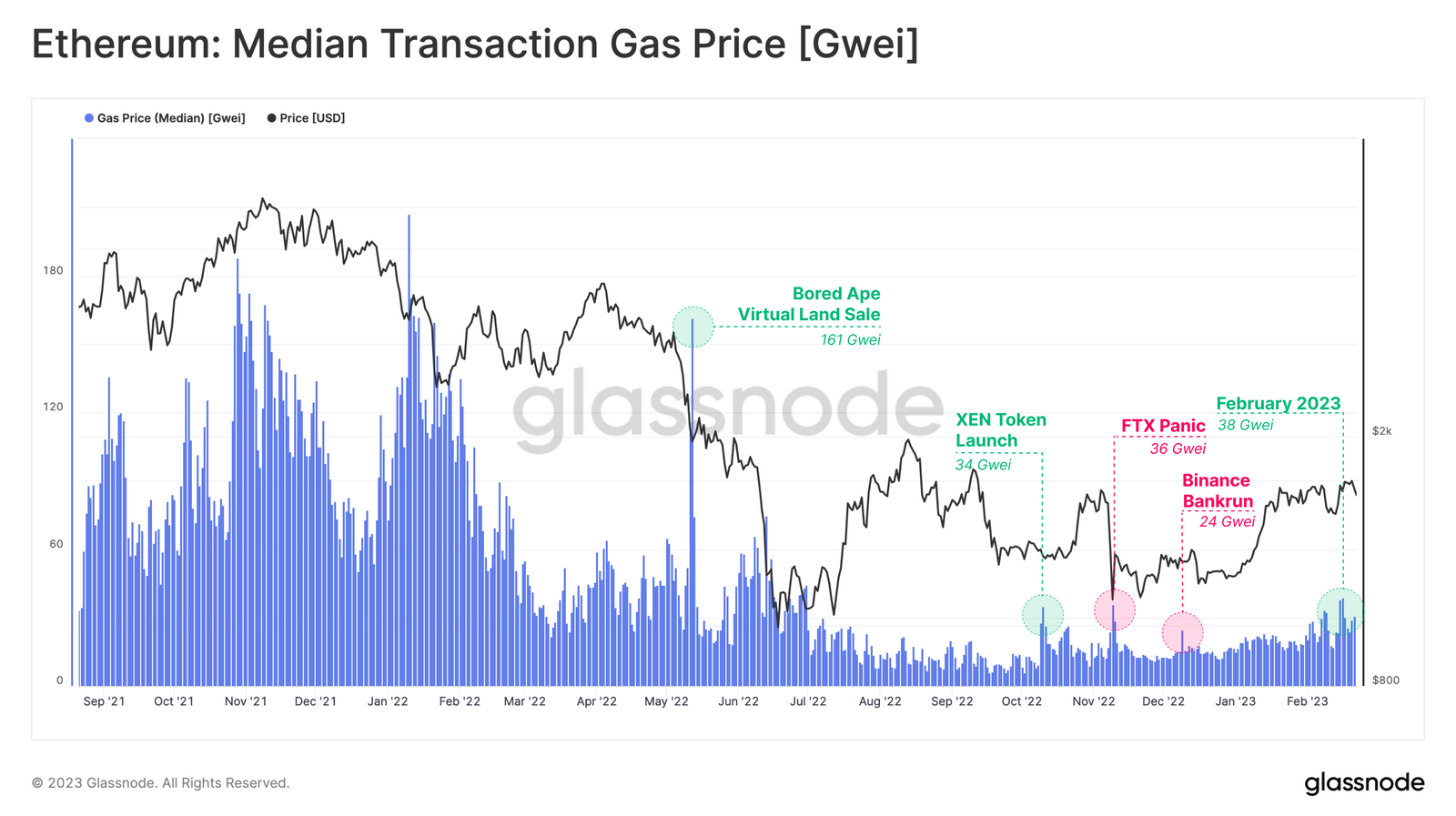 Rendahnya gas fee mengindikasikan kurangnya permintaan blockspace dan sedikitnya aktivitas di aplikasi Ethereum. Kondisi ini biasanya terjadi dalam bear market.