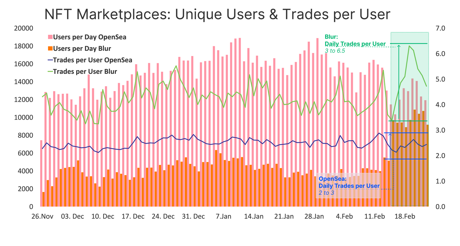 Blur mencatat ada empat sampai lima transaksi yang dilakukan pengguna per harinya. Sementara pelanggan OpenSea rata-rata hanya melakukan transaksi dua kali per hari.