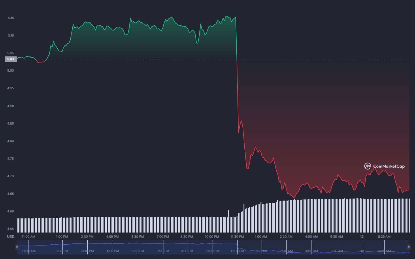 Harga ApeCoin turun hampir 8% dalam 24 jam terakhir menjadi $4,66 per token pada saat tulisan menurut data Coinmarketcap. Harga tertinggi dalam periode yang sama sebesar $5,16. Sedangkan volume perdagangan ApeCoin dalam 24 jam terakhir naik hingga 142%.
