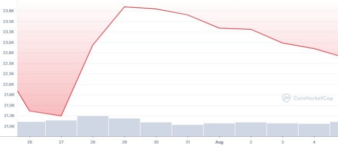 Pengumuman FOMC kelima pada 27 Juli menyatakan suku bunga naik 75 basis poin dari 2,25% ke 2,5%. Bitcoin terpantau bergerak bullish selama dua hari sebelum kemudian turun perlahan.