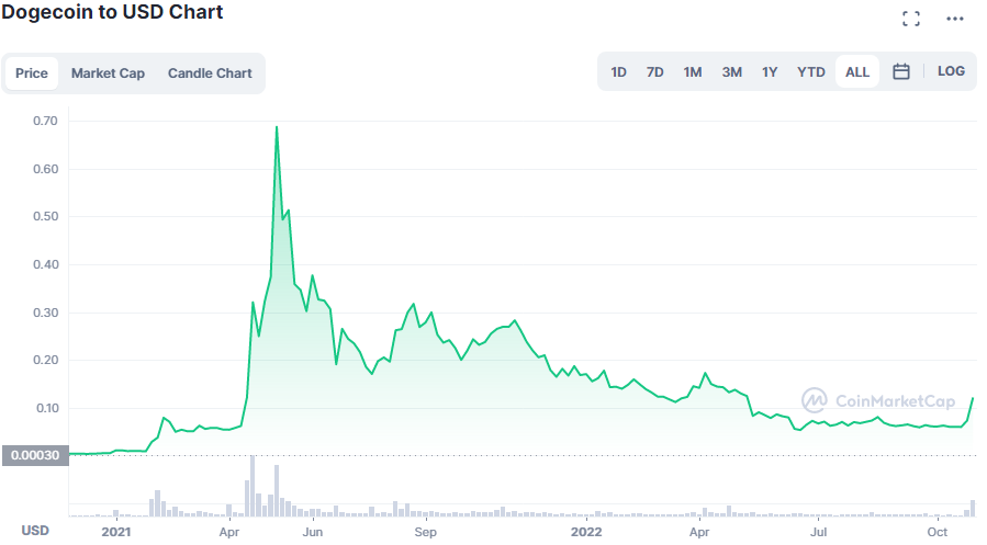 Pergerakan harga DOGE dari ATH pada Mei 2022 (sumber: CoinMarketCap)