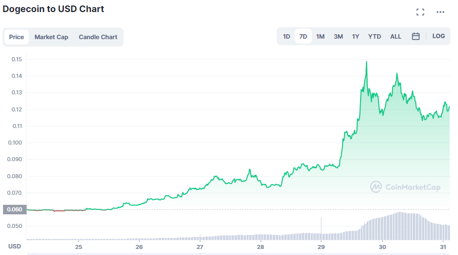Pergerakan harga DOGE dalam sepekan terakhir (sumber: CoinMarketCap)