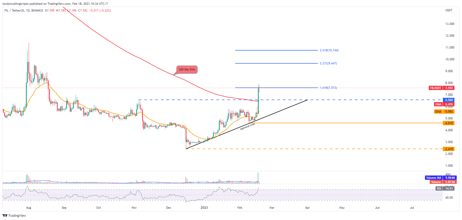 Pergerakan impulsif terjadi pada penutupan kandil harian 17 Februari. Harga FIL melambung tinggi hingga berhasil 200-day EMA di level $6,477 yang saat ini berfungsi sebagai dinamis support apabila harga FIL koreksi.