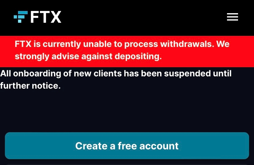 Indikasi devaluasi aset dan krisis likuiditas ini terlihat dalam pengumuman pada web FTX. Pada 9 November, situs web FTX memasang banner baru yang menyatakan bahwa bursa tidak lagi dapat melayani penarikan dari pelanggan.