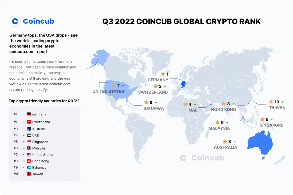 Duduk di peringkat kedua adalah tetangga Jerman, Swiss, yang memiliki regulasi kripto yang positif dan merupakan rumah bagi beberapa pelaku industri kripto teratas di dunia. Tiga tempat berikutnya dalam daftar tersebut masing-masing diakuisisi oleh Australia, UEA dan Singapura.
