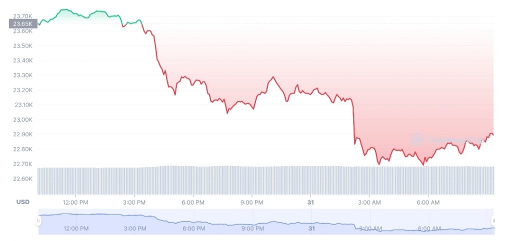 Data CoinMarketCap memperlihatkan BTC sempat menyentuh harga perdagangan di bawah $22.600, sebelum kembali naik perlahan ke kisaran $22.850 pada pukul 10.00 WIB. Sebelumnya pada 30 Januari, Bitcoin sempat naik ke harga jual lebih dari $23.900 per keping.
