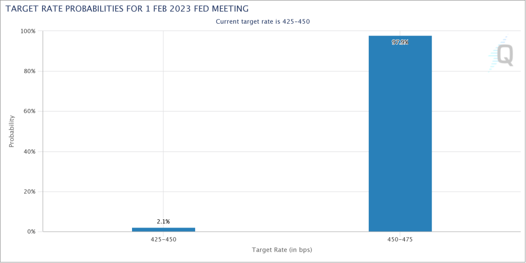 Diprediksi The Fed bakal menaikan suku bunga antara 25 basis poin (bps). Data CME FedWatch Tool menunjukkan mayoritas pelaku pasar memprediksi kenaikan suku bunga mencapai 25 basis poin ke kisaran 4,5%-4,75% dari kisaran saat ini 4,25%-4,5%.