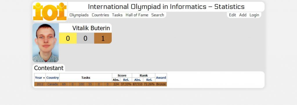 Vitalik Buterin saat menjadi peraih perunggu Olimpiade Internasional Informatika 2012 (Sumber: ioinformatics.org)