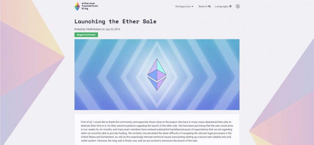 Pengumuman penawaran koin ether perdana pada 22 Juli 2014 (Sumber: Ethereum Foundation)
