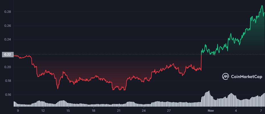 Data CoinMarketCap menunjukkan tren bullish Chiliz sudah terjadi selama sepekan terakhir. Pada 7 November 2022, CHZ bahkan sempat menyentuh harga jual tertinggi dalam enam bulan terakhir, yakni pada angka $0.2906 per keping.