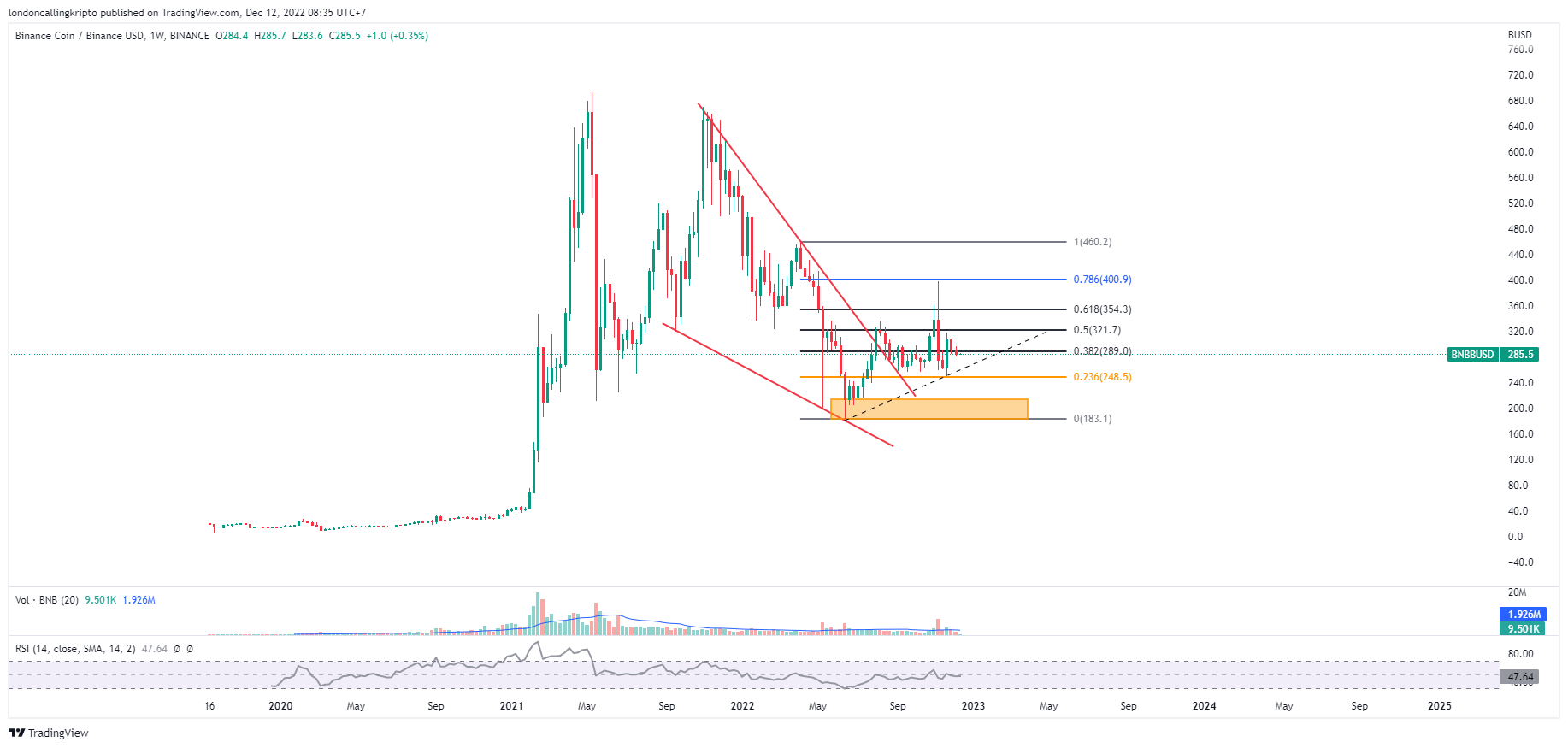 Penutupan kandil mingguan BNB tidak terlihat baik karena berada dibawah level $289 yang sebelumnya merupakan titik support yang saat ini berubah fungsi menjadi resistance terdekat.
