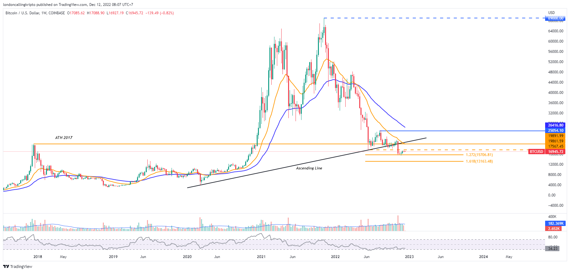 Laju naik Bitcoin tertahan saat mendekati support yang berubah fungsi menjadi resistance pada level $17.567 dan merupakan major support sebelumnya yang terbentuk pada Juni 2022.