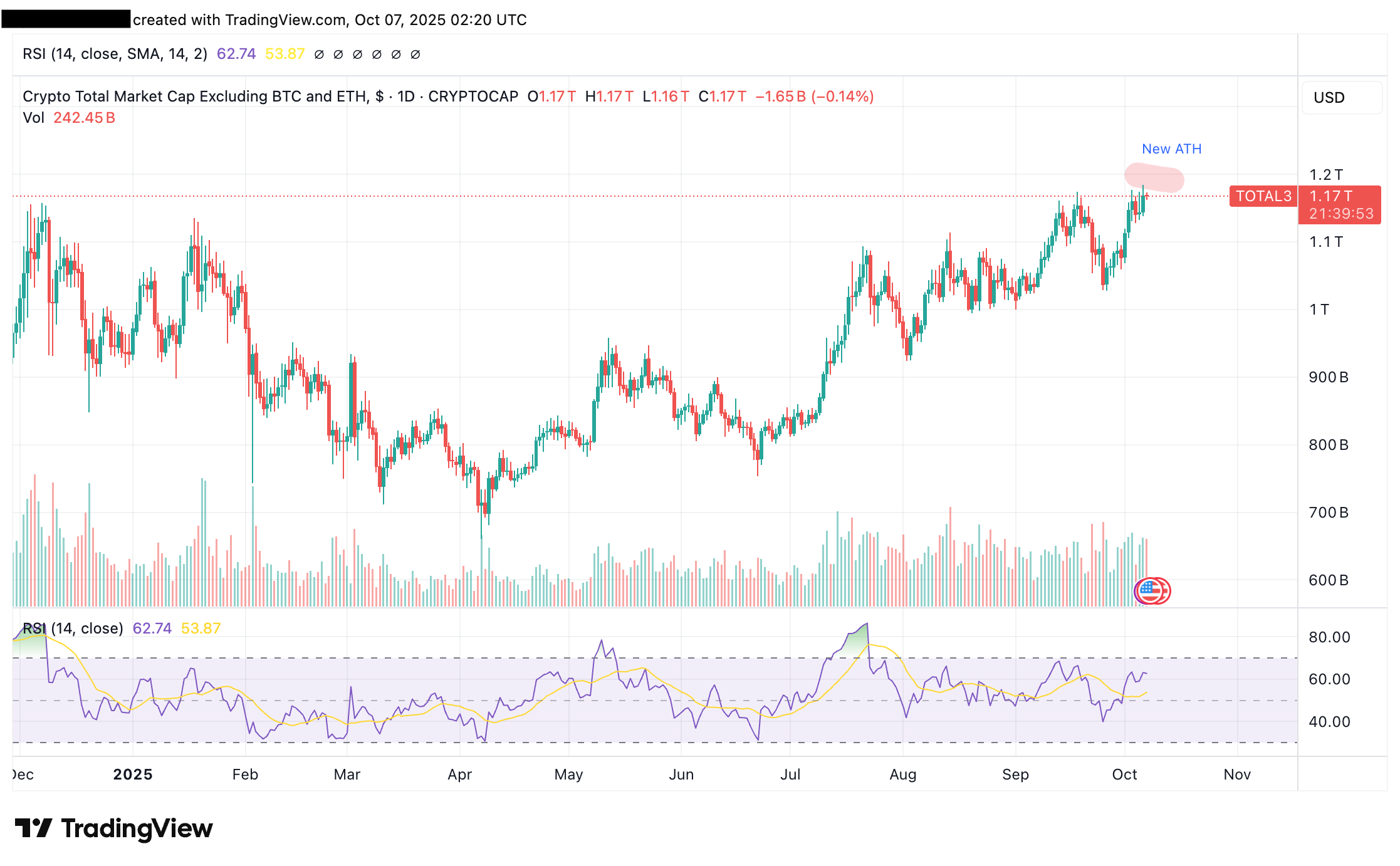 Grafik TOTAL3 yang melacak kapitalisasi pasar seluruh aset kripto atau cryptocurrency kecuali Bitcoin (BTC $124.670) dan Ether (ETH $4.680), mencapai rekor tertinggi baru di $1,18 triliun pada perdagangan Senin, 6 Oktober 2025. Metrik ini juga mencatat penutupan mingguan tertinggi sepanjang sejarah pada hari Minggu, melampaui puncak kapitalisasi pasar dari tahun 2021.