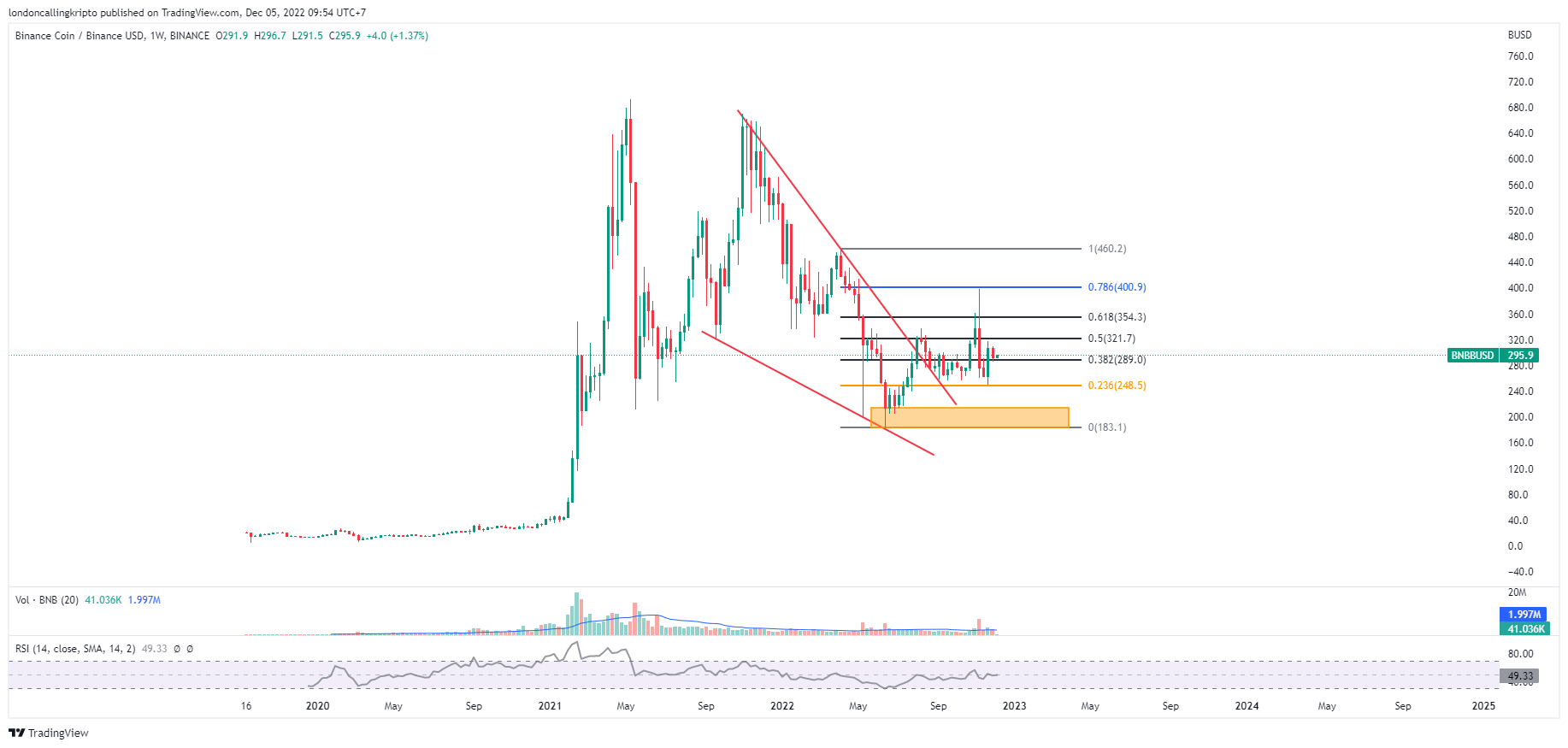 Penutupan kandil mingguan BNB harus ditutup merah, dengan penurunan sebesar 5,07%. Pergerakan harga BNB mengalami koreksi setelah naik tinggi pada kandil mingguan 21 November.