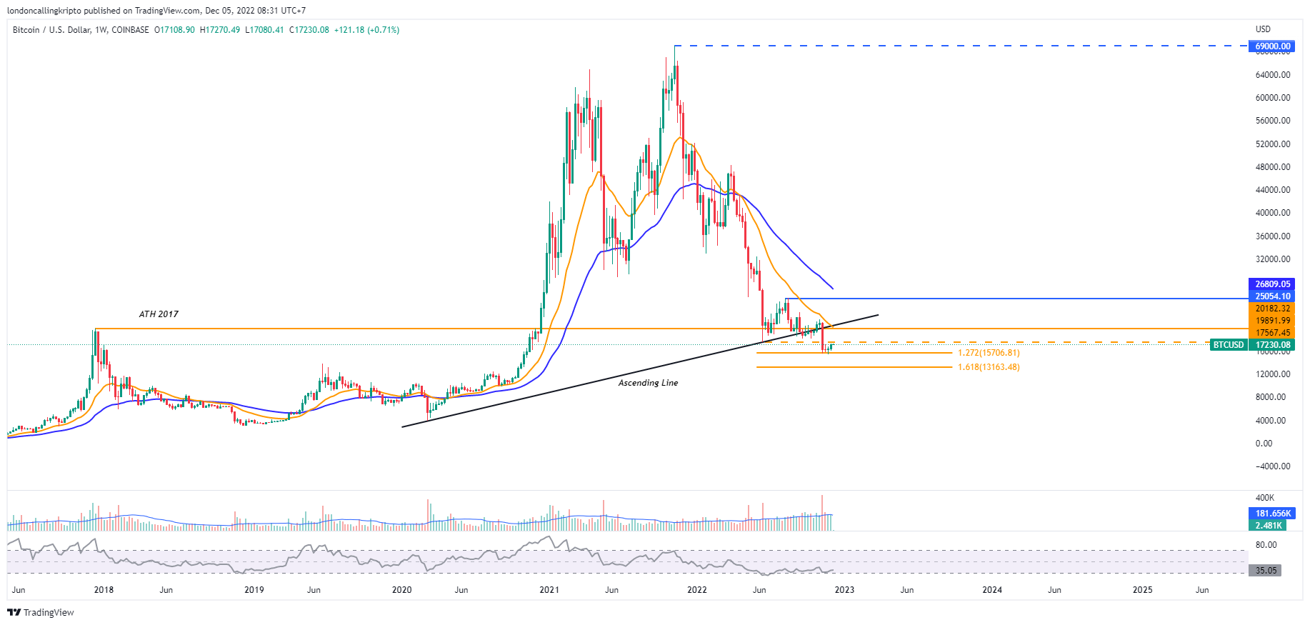 Weekly candle BTC pagi ini ditutup pada harga $17.108, level tertinggi berada pada harga $17.317 dan level terendah berada pada harga $15.992.