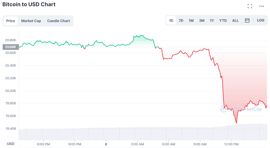 Sementara Bitcoin (BTC) ikut kembali menukik ke $19.800 setelah sempat sideways untuk beberapa hari di kisaran $20.000. Penurunan yang sama juga dialami Ether (ETH) dan altcoin lainnya.