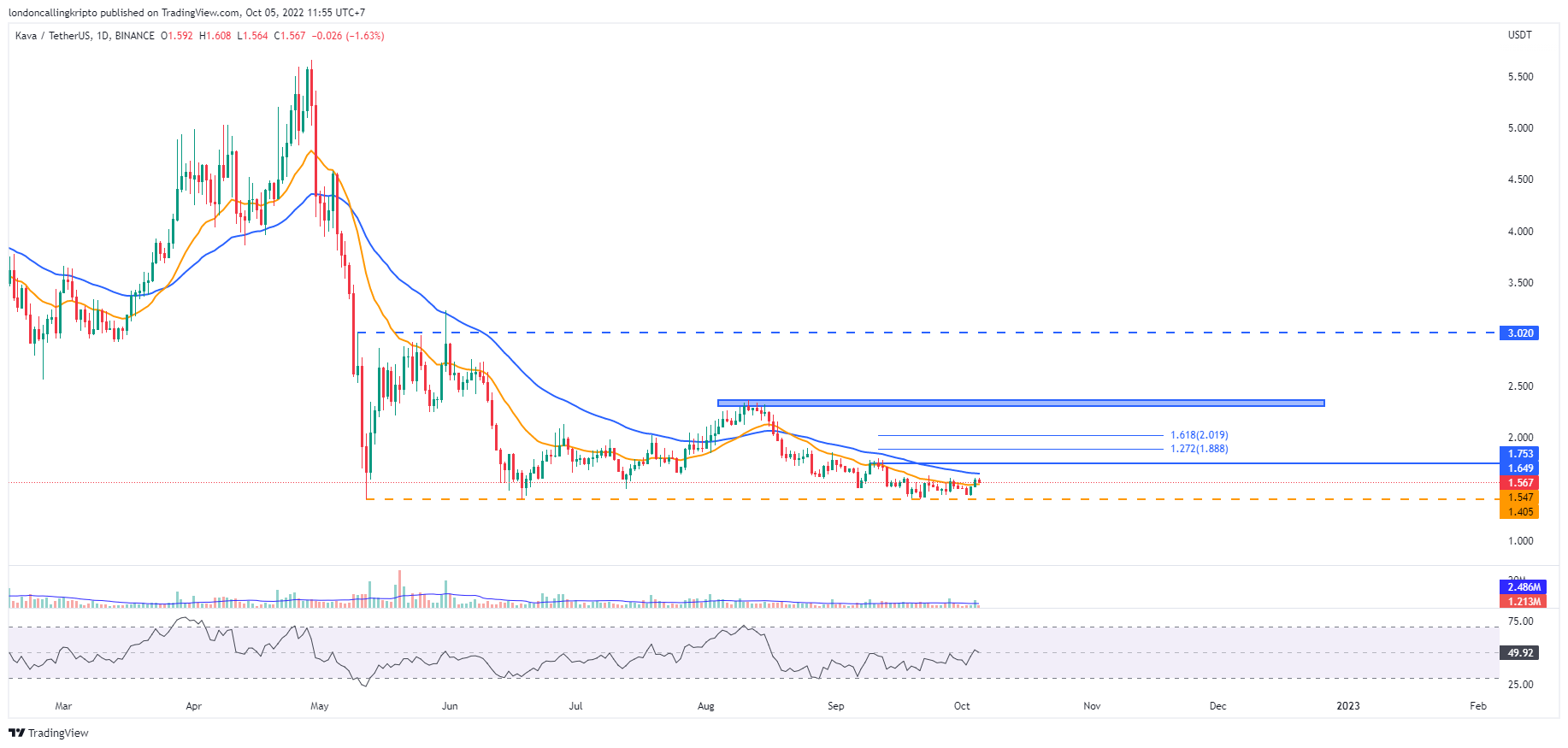 Major support KAVA berada pada harga terendah pada kandil harian 12 Mei di level $1,405 yang menjadi benteng pertahanan terakhir apabila 20-day EMA yang menjadi tahanan terdekat berhasil ditembus.