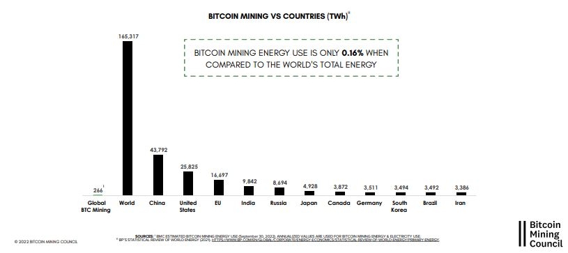 Dalam laporan kuartal tiga 2022 tersebut, BMC mengumpulkan data dari 51 perusahaan penambangan Bitcoin terbesar di dunia. Ditemukan bahwa penambangan Bitcoin menghabiskan listrik 266 TWh dibandingkan dengan 165.317 TWh energi yang dihabiskan di seluruh dunia. Jumlah konsumsi listrik itu, jauh lebih kecil ketimbang beberapa negara seperti China, AS, Uni Eropa, Rusia, India, Jepang, Jerman, dll.
