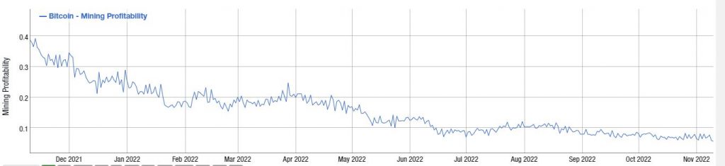 Profitabilitas penambangan BTC tersebut anjlok 74% bila dibandingkan dengan awal tahun 2022 saat indeks profitabilitas menunjukkan angka 0,231.