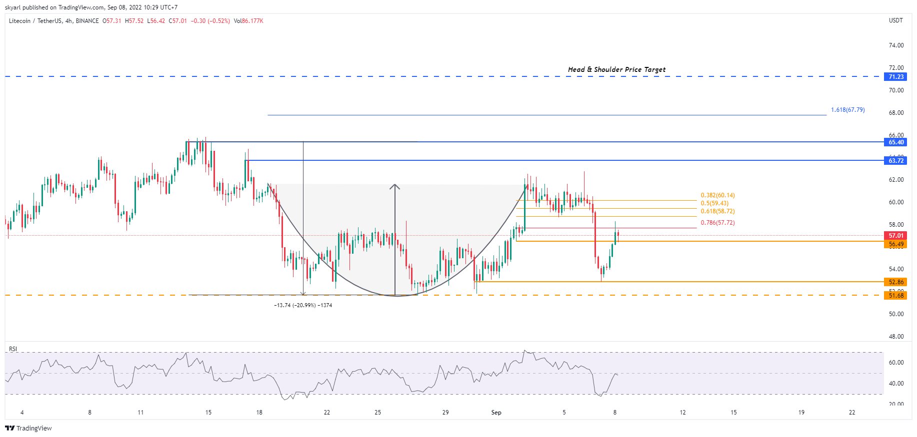 Penurunan harga LTC pada 6 September menjadikan pola cup and handle tidak valid. LTC turun cukup dalam sebesar 10,4%. Penurunan tersebut tertahan support di level $52,86. Saat ini terlihat pergerakan harga LTC mulai pullback dan berhasil menembus resistance pada level $56,49 yang sekarang beralih fungsi menjadi tahanan untuk menahan laju penurunan LTC.