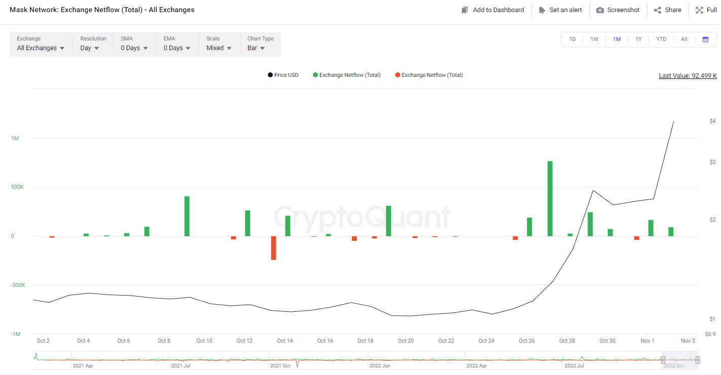 Tercatat sebanyak 4.960.784 MASK masuk ke dalam exchange pada 29 Oktober. Jumlah tersebut merupakan arus masuk tertinggi dalam satu tahun terakhir.