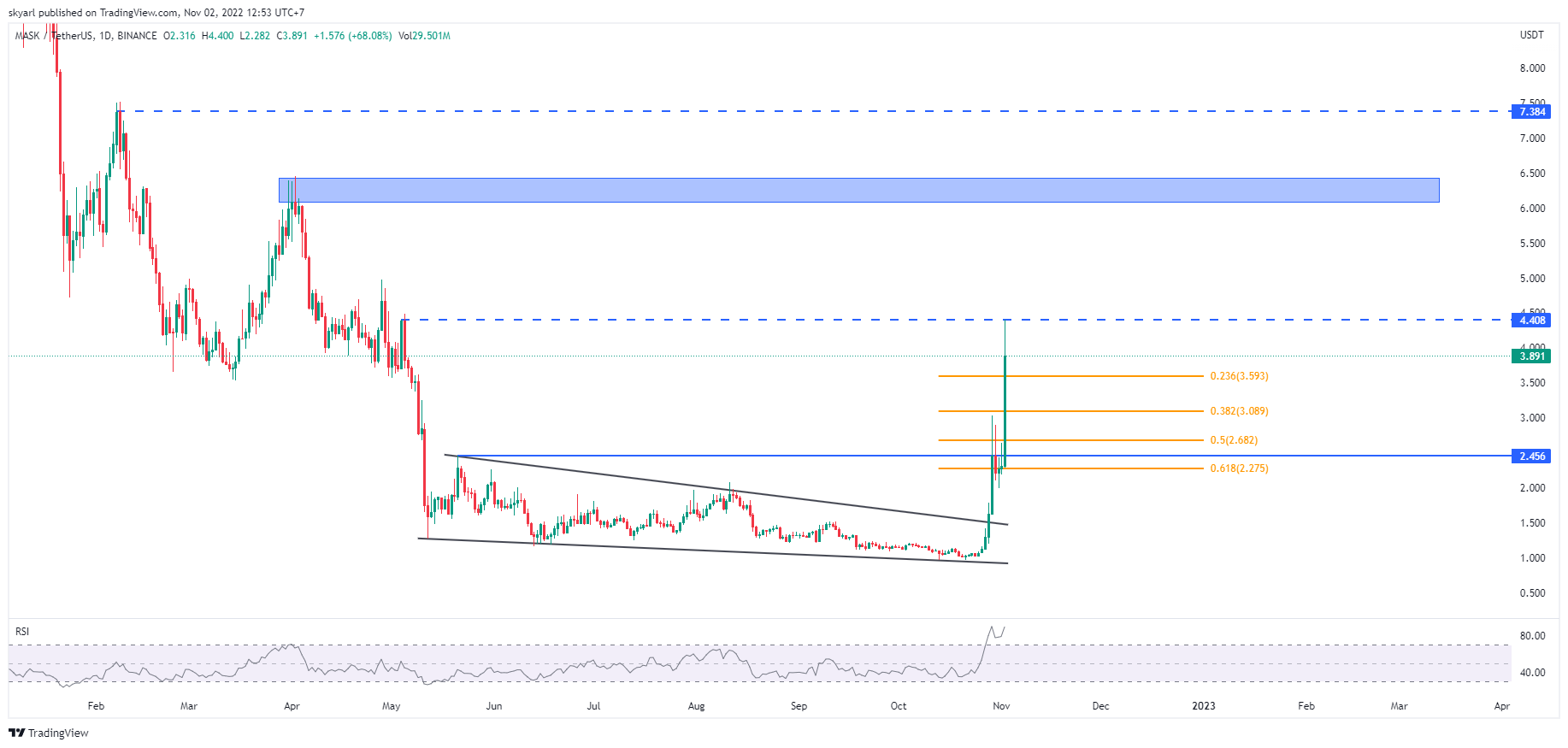 Saat artikel ini dibuat, harga MASK kembali pumping, naik sebesar 89,98% dari pembukaan harga pada kandil harian 2 November di level $$2,316 hingga harga tertinggi sementara pada kandil harian di level $4,400. Naiknya harga MASK hampir menyentuh resistance pada penutupan kandil 4 Mei di level $4,408.