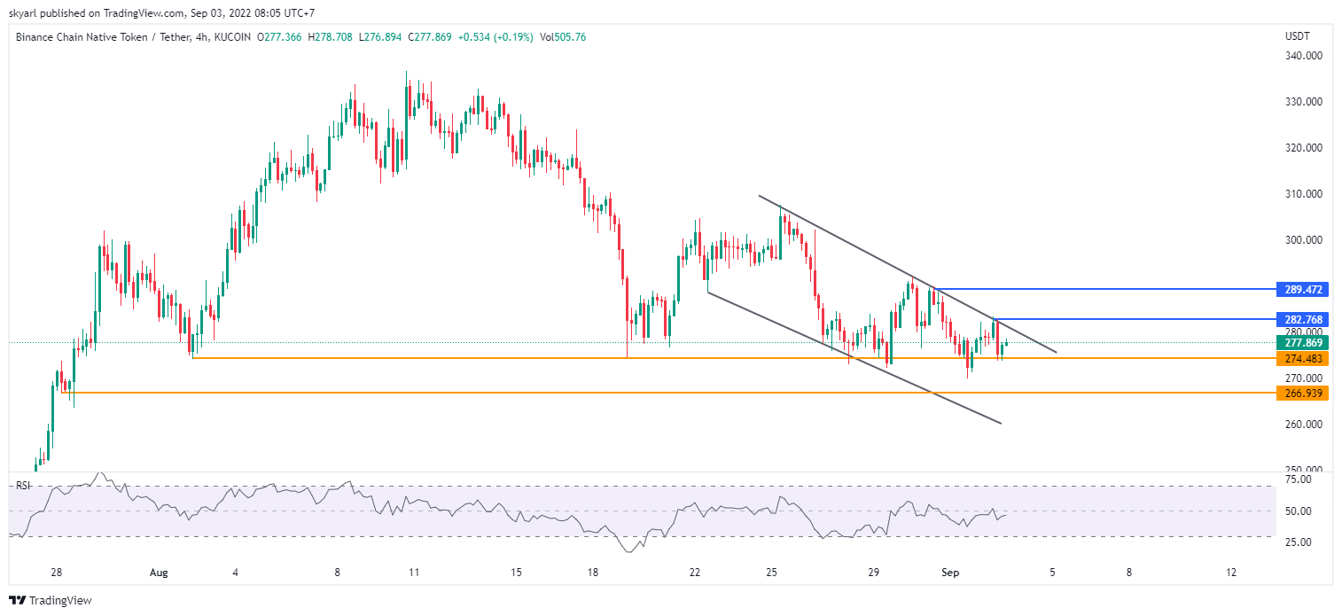 Target naik berada pada resistance di level $282. Jika harga BNB berhasil breakout titik tersebut, maka laju naik selanjutnya berada pada level $289.