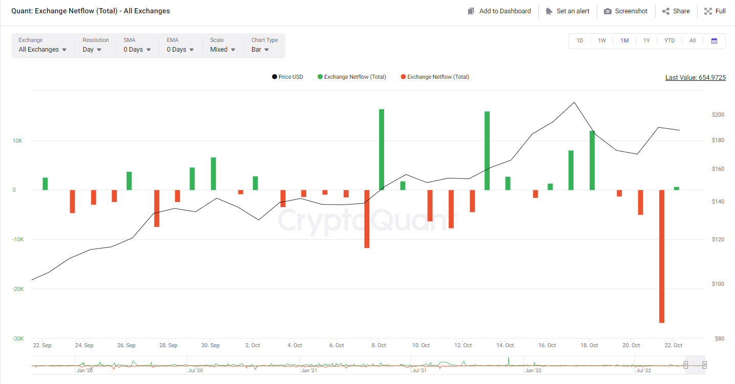 Naiknya harga QNT menjadi pemicu positif untuk mendorong daya beli pelaku pasar kripto. Berdasarkan data pada Cryptoquant, QNT exchange netflow dominan ditutup negatif selama sebulan terakhir.